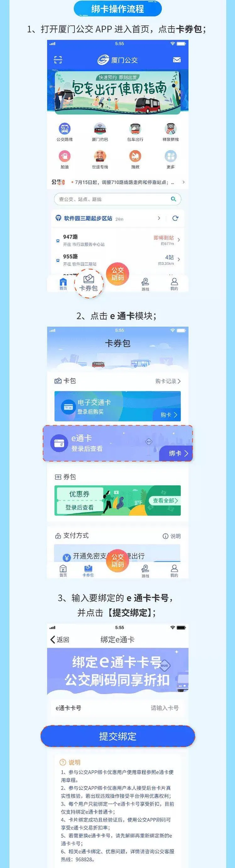 暖心建议大家   登入手机e通卡操作的简单,四步进行,信用卡种类登入手机好且工作经验证后,选用“福州公交车路线APP”刷码就可以得到e通卡的交易折扣券率,也避免了抱出去带卡的困扰。   绑卡阶段仅兼容捆绑手机e通卡通常卡,每家APP大家只有捆绑手机一款e通卡卡号,绑卡优慧需认可网页卡种完美性核实,若显现违法操作方法,能够被暂停服务优慧追求。